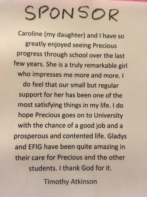 Sponsors receive yearly progress reports of the girls whose education they sponsor and may write to them c/o EFIG in Africa. Please make a one-off donation or PLEDGE SPONSORSHIP of the education of a girl living in poverty. You could do this by yourself or jointly, for as much as you like or as long as you like, and till the girl is 16 or further. Simply knowing that someone minds enough to care makes a difference to the life of a child.
